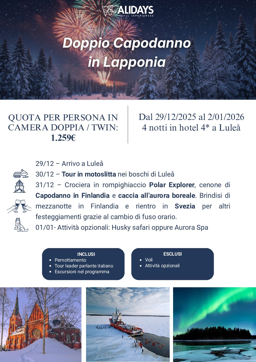 DOPPIO CAPODANNO IN LAPPONIA DAL 29/12/2025 AL 2/01/2026 Galleria DOPPIO CAPODANNO IN LAPPONIA DAL 29/12/2025 AL 2/01/2026 Proposte, Varie DOPPIO CAPODANNO IN LAPPONIA DAL 29/12/2025 AL 2/01/2026 Di Marco|2025-10-10T17:48:12+02:0010 Ottobre 2025|Proposte, Varie| Continua a leggere 0